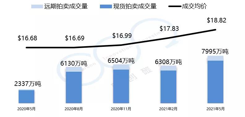 加州-魁北克碳市場的初始配額發(fā)放以拍賣為主,每個季度舉行一次拍賣。2021年5月的第27次拍賣均價與總成交量創(chuàng)歷史新高。拍賣均價為18.82美元,較上一季度漲幅為5.6%,總成交量為7995萬噸。以下是由中創(chuàng)碳投統(tǒng)計的加州-魁北克碳市場近一年的交易情況。
